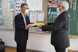 10月31日(月)は、都城地区地域安全協会の事務局長、甚野さんと、西脇さんが来校され、マグネットシート等の防犯グッズの贈呈式がありました。