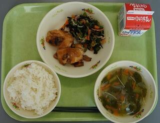 「今日は、全国のみなさんから寄せられた「ふるさと納税」の 寄付金を活用した「ふるさと給食」です。今年は都城産のとり肉を焼いて、ソースをかけています。しいたけ、ほうれん草、チンゲンサイは宮崎県で作られたものを使っています。ふるさと都城で生産された食材をしっかり味わって、おいしくいただきましょう。」