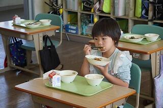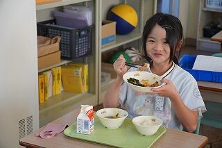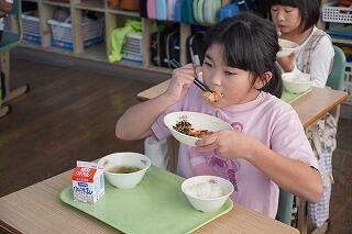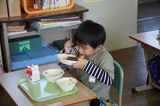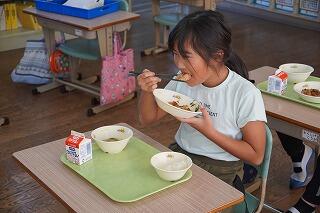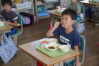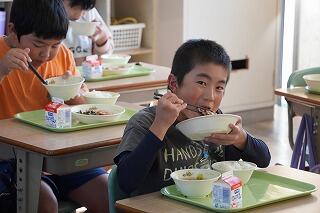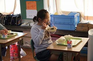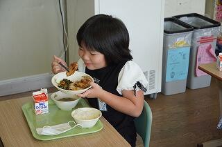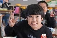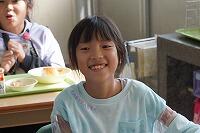 子どもたちに感想を聞いてみました。「おいしい」「おいしくて、肉が大きい」「『おいしい』しか言えないです」、どの子も、満足していました。「もっとごはんが食べたいです。もう一個(一人2個)で、ごはん2杯はいけます」と、5年生の子どもたち。午前は高城小、有水小の子どもたちとの合同学習があり、体育のドッジボール大会でエキサイトしていたので、一層おいしかったようです。