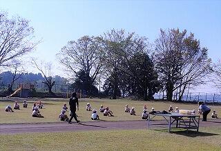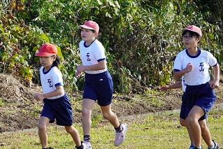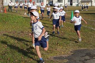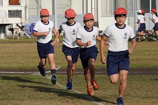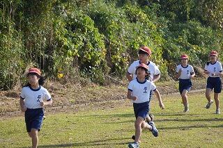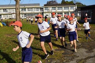 コースは、運動場から、南門を出て、石山球場を周り、再び、運動場に戻ってくるコースです。学年によって運動場や石山球場を回る数が違います。石山球場が広くて、子どもたちも「遠い!」と、運動場で練習していたとはいえ、初めての校外走できつかったようです。
