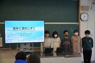 図書やネットで調べるだけでなく、5月には都城歴史資料館や陸軍墓地、西飛行場跡、トーチカ跡(横市町)を見学しました。また、7月には戦争体験語り部の藤田悦子先生からお話を伺いました。8月には都城市戦没者・空襲犠牲者合同追悼式に参加、10月には修学旅行で知覧特攻平和会館見学等の学習を経て、今回の発表となりました。年間を通して、平和の尊さを考え、自分たちが平和学習で学んだこと、そして、自分たちにできることや平和へのメッセージを発表していました。