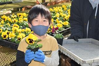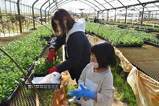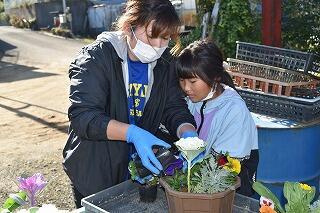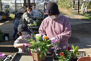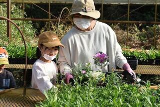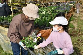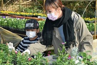 家庭ごとに花の苗を16本ずつ選ぶときには、色とりどりの花々を前にして子どたちも、保護者も心弾む表情で苗を手にしていました。選んだ花を植えるときには、親子であれこれ会話をしながら穏やかな表情で幸せな時間を過ごすことができたようでした。