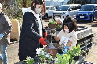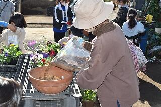 まず、花植えをするにあたり、稲元さんが、土の量や苗の配置の仕方、実際に植えるときに気を付けること等、分かりやすく説明しながらデモンストレーションをしてくださいました。ユーモアを交えながらお話されるので、子どもたちも、保護者の方も話に聞き入り、笑顔になっていました。