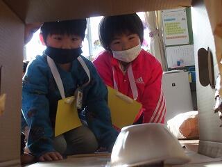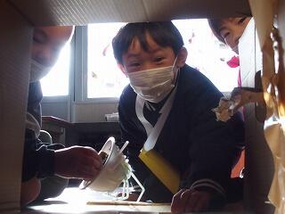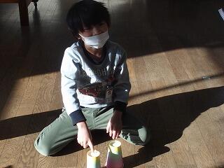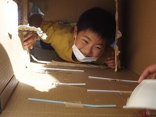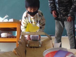 カップ麺の容器に、ゴムで乾電池をつなぎ付け、ゴムが縮む力を利用して乾電池が車輪のように回転し前に進むおもちゃが準備されていました。段ボールで作ったトンネルの中を走り、進んだ距離で点数が付く遊びでした。コトコトと歩くように動く様子に大喜びして、何度も繰り返し動かして遊びました。