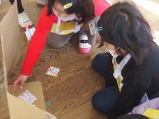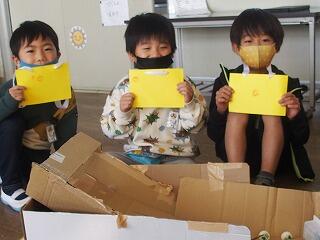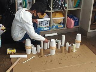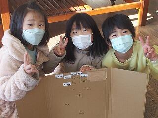 牛乳パックや厚紙、輪ゴムで作ったおもちゃが飛び上がった高さで点数を競う遊びでした。おもちゃが飛び上がるたびに歓声を上げて喜び、何度も繰り返し飛ばして楽しみました。得点板には、1年生の名前を貼る工夫がなされ、満足そうな表情の1年生たちでした。