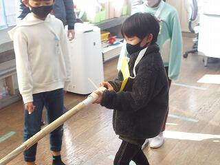紙の筒につけたゴムが縮む力を利用して筒型(トイレットペーパーの芯)の球を的に向けて飛ばす遊びでした。的の先には、複数の紙の筒などで作ったピンが立ててあり、何本倒すかを競うようになっていました。