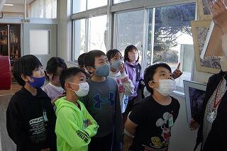 子どもたちが校長室を尋ね、「校長室の古いもの探検」をしました。歴代の校長先生の顔写真や沿革史、学校の航空写真等を調べていました。