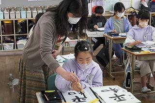 先週、4年生が「書き初め」に挑戦していました。5年生と同様に、都城市・三股町小中学校書写展に出品する予定です。