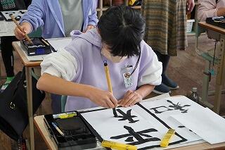 子どもたち曰く「難しい」、特に「和」が難しかったようです。「和」は左右の位置や大きさの違いがあることを考えて書く必要があり、加えて、払い・止め・折れなど基本的な筆使いも含まれています。さらに、一字一字の組み立て方はもちろん、二文字の字配りについても考えて書く必要があります。