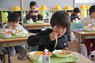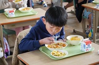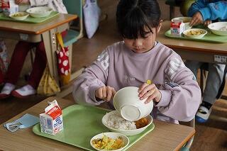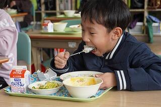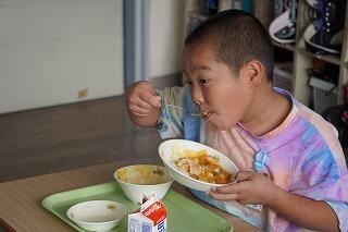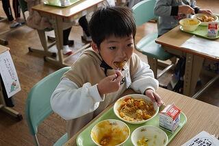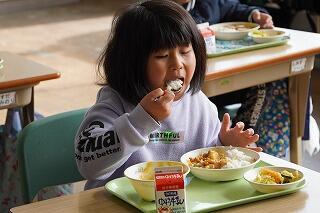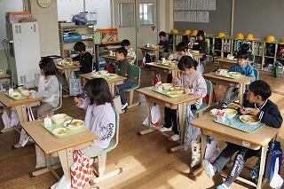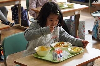 給食時間に1年生と2年生の教室に行くと、実においしそうに食べていました。「おいしいです!」と子どもたち、「おかわりがしたいです。」と食欲もりもりの様子でした。