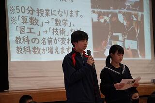 後半は、保護者の皆様も参加して、生徒会からの学校生活の説明や、係の先生方からの生活の心得や学習についての話がありました。