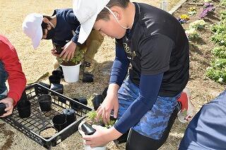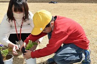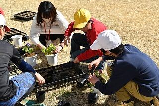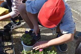 今日の昼休み時間は、栽培美化委員会の子どもたちと一緒に、アネモネの苗の植え替えをしました。