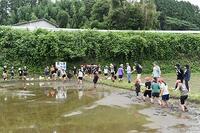 田植えの準備や稲刈りなどを毎年してくださっている、大古殿 様や、5年生の保護者の方々に手伝っていただいて、今年も田植えをすることができました。子どもたちは、6年生がお手本となって、5列ずつ植えていきました。「柔らかい土が、足の指の間を抜ける感触が気持ちいい。」と歓声を上げる子どもがいました。