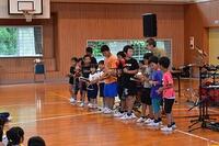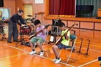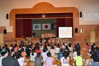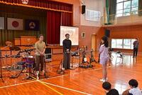 時には力強く、時にはもの悲しい三味線の音色や、いろいろなパーカッションから響くリズムに子ども達は引き込まれて最後まで集中して聞いていました。途中、体験コーナーでは、代表の友だちが三味線やパーカッションを演奏し、その他の児童は手拍子で演奏に参加しました。とても楽しい時間を過ごすことができました。