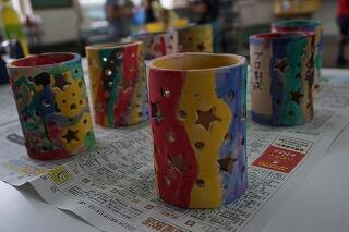 まず、石山観音寺住職の松下勝冠様に、石山観音寺のキャンドルナイトについてのお話をしていただき、幸の陶の吉岡幸江様と山本眞智子様に準備していただいたキャンドルホルダーに色を付けました。6色のアクリル絵の具を塗り分けてオリジナル作品を作り、思い思いのメッセージを書いて完成しました。