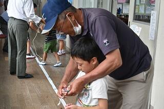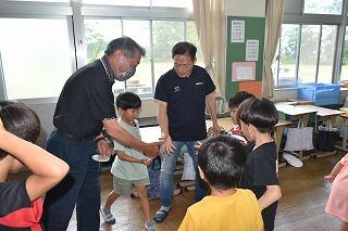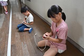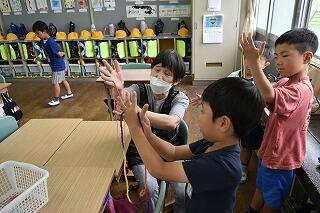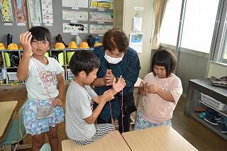 6月30日(金)ふれあいの日には、大雨の中、地域の方々(サンサンクラブ)が来校してくださって、1・2年生と幼稚園生に「昔の遊び」の遊び方を教えて下さいました。