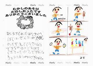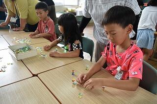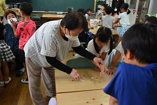 遊びは、「おはじき、お手玉、あやとり、けん玉、めんこ、こま回し」の6種類でした。遊んだことがある子も初めて遊びに触れる子も、真剣そのものでした。サンサンクラブの方々は、子どもたちの「できるようになりたい」という思いを察してくださって、何度も優しく教え、励ましてくださいました。