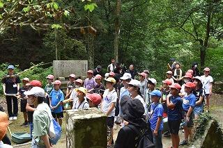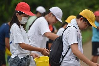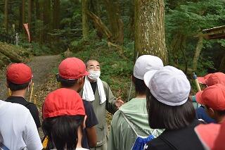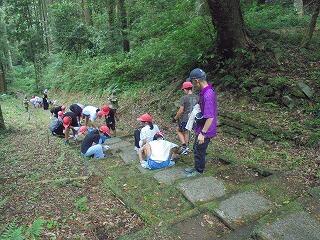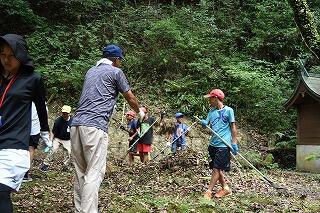 久々の実施とあって、子どもたちだけでなく、保護者や自治公民館長の方々や教職員もワクワクした気持ちで階段が続く参道を上りました。住職の松下勝冠様より、石山観音寺をきれいに掃除することの意味を教えていただき、参加者全員が、目的意識をもって取り掛かりました。子どもたちは、その目的の意味を理解し、「地域の人々のためや、遠くからお参りに来られる多くの方々のために石山観音寺をきれいにしよう」と、進んで取り組みました。