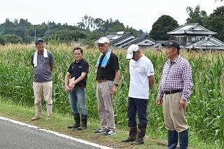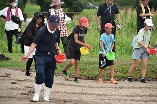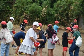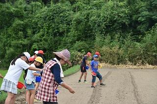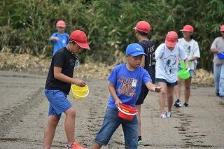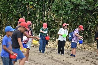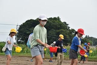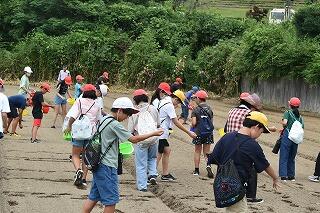石山観音寺近くにある2か所の畑に、コスモスの種をまきました。畑の縦と横の一列に並びそれぞれ歩いて前進し、途中で交差して、畑一面に種をまきました。地域の方が、お手本を見せてくださり、コツを見習って子どもたちがぱらぱらと種をまいていきました。