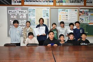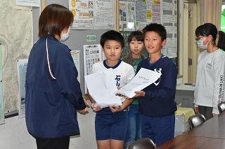 代表児童が、自分たちだけではなく保護者、地域の方の思いも届くようにと言葉を添えて手渡しました。