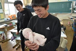 於田様は、「命の大切さ」について、新生児や胎児人形、産声の録音テープ、さだまさしの歌、相田みつをの詩などを使いながらお話をしてくださいました。子どもたちは、「助産師はお母さんと向き合い、出産を命がけで助けているんだと分かりました。」「さだまさしさんのうたを聞いて生まれてくるということは奇跡ということが分かりました。」「赤ちゃんの人形をだっこしたり、見ていたりしたら、いつの間にかみんなが笑顔になっていて命ってすごいと思った。」「ぼくはもらった命を大切にしようと思いました。」「家族に感謝し、命を大切にしていきたい」等の感想をもちました。また、自分の生い立ちやどうして助産師の仕事を選んだのか等のお話をしていただき、子どもたちにとって自分の将来の夢について考えることができました。本当にありがとうございました。