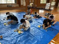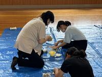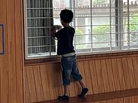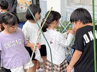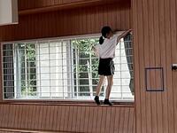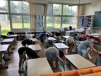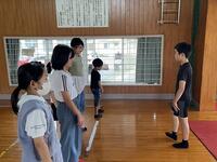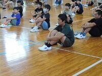 体育館そうじの様子です。リーダーからの指示のもと、そうじがはじまります。一人一人、考えてそうじをする姿がみられます。子どもたちに、いろいろな活動をさせることにより、「自分で考えて動ける子」を育てています。先生方も子どもといっしょに活動するようにしています。このことは、「魅力ある学校づくり」につながっていきます。