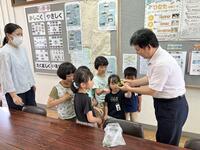 1年生が生活科の学習でやさいをそだてています。収穫できたやさい(こどもピーマン・オクラ・ミニトマト)を校長先生にプレゼントしにきました。やさしい1年生に感謝ですね!