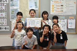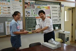 石山少女バレーの子どもたちが6月8日、9日に行われた都城地区予選会の報告のために校長室を訪ねてきました。都城地区予選会では見事3位だったので、6月22日(土)に行われる県大会に出場することが決まったことを報告してくれました。子どもたちは「3位はくやしかったので、県大会では1位を目指します。」「みんなで声を出して練習をがんばります。」と都城地区で3位だったことの悔しさと県大会への意気込みも話してくれました。