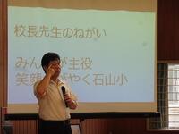 校長先生のねがい・合言葉「みんなが主役 えがおかがやく石山小」が子どもたちに定着してきました。子どもたちも意識して取り組んでいるようです。写真で、「右側一列移動ができている学年の様子」「トイレのスリッパをならべている子の様子」をみせられて、子どもたちのよいところを紹介されていました。子どもたちは、集中してきいていました。これからも、さらによい石山小学校はなっていくことでしょう!