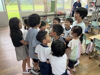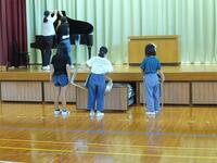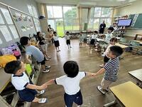 1年生と幼稚園生の学習の様子です。音楽の時間、みんなでたのしく、なかよく学習をしています。えがおいっぱい、歌いながら動きをしていました。