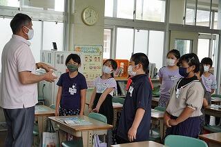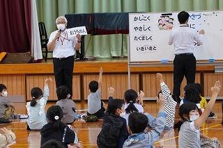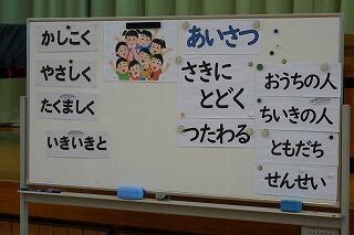 校長先生からは、学校の教育目標である「かしこく」「やさしく」「たくましく」「いきいきと」した子どもになるために、「あいさつ」をがんばってほしいという話がありました。「先に届く挨拶」「相手に伝わる挨拶」をすること、朝起きて、まずは「おうちの人」に「おはよう」と挨拶することなど、話がありました。「都城市一、いや、宮崎県一、日本一、すばらしいあいさつのできる学校をめざしましょう。今、がんばると決めてください。」ということばで締めくくられました。