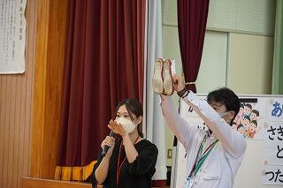 生徒指導主事の先生からは、今月の目標について話がありました。今月の目標は「はきものをそろえる」です。靴箱の靴の踵を揃える、トイレのスリッパを揃えると具体的に揃え方を示しながら話がありました。これから1週間、毎日、できているか見届けをして子どもたちに伝えていきます。