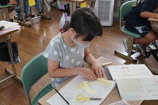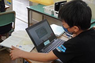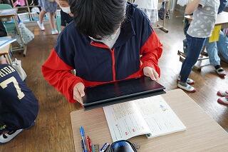 今日はインタビューに向けて、メモづくりをしたり、インタビューの仕方を学習したりしていました。付箋紙を使ってインタビュー内容を整理したり、ノートやパソコンを使ってインタビューの簡単なシナリオを書いたり、パソコンで教科書のQRコードを読み取って動画でインタビューの仕方を学習したりと、子どもたちそれぞれの学習の進み具合や目的、必要性に応じて学習を進めていました。一斉に動画を見たり、一斉に付箋紙を貼ったりする学習活動から個別に学習を進める方法に変わってきています。