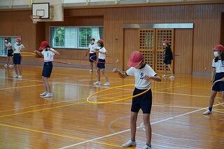 伸び伸びとした動作で全身を動かしたり、縄やボール、フープ等の用具を使って運動したりしていました。