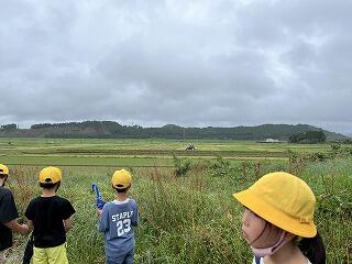 学校の西側を歩き、目印になるものや道の両側の様子、どんな建物があるか、どんなことに使われているのか等について調べました。公民館、児童館、郵便局、神社などを見ました。方位磁針を使って、どの方角に何があるのかも調べました。神社の西側に広がる田畑を見て、子どもたちは「すごい!」「こんなに広がっている!」と感動していました。同じ道路でも歩いてみると多くのことに気付きます。