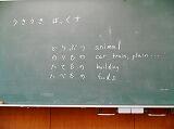 その後はビンゴゲームです。9個のマスに14の野菜やくだものから好きなものを選んで書き込みます。先生が英語で「tomato や banana などのカードを見せて同じものに〇をつけていきます。外国語活動が始まった3年生、楽しみながらのYD学習でした。