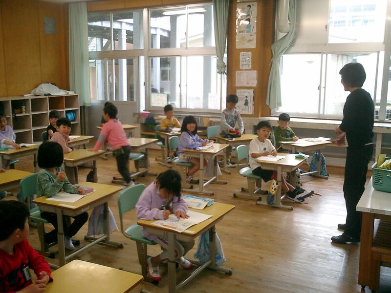 今日から1年生は、楽しみにしていた昼休み時間が始まったのですが、今日はあいにくの雨です。教室で昔話を見ておりこうに過ごしていました。