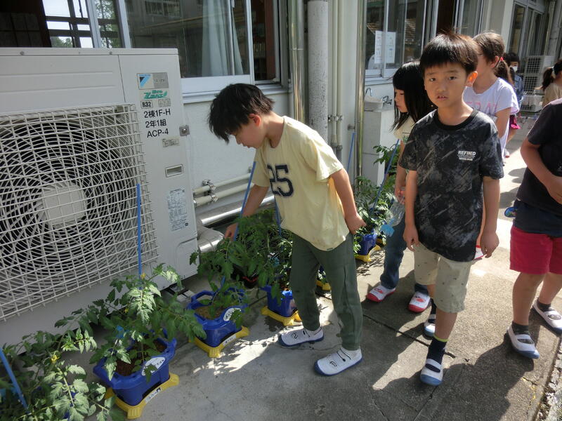 1時間目の休み時間、2年生がミニトマトに水をあげていました。