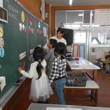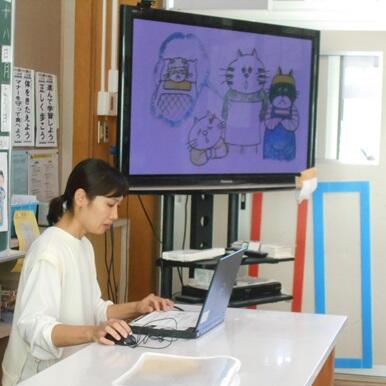 手作りのお話から始まり、子どもたちは、興味津々です。学級担任から実態を聞いているので、子どもたちに合わせた教材を準備してくださいました。