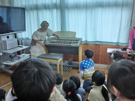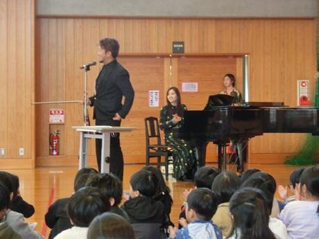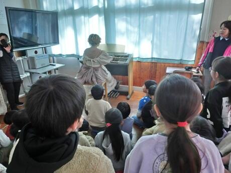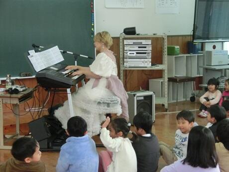 今日は、1・2年生でミニコンサートを開きました。出演者は、保護者の方から紹介された、西都市出身のエレクトーン奏者、古賀美咲さんです。普段は、東京でミュージシャンとして活躍されています。