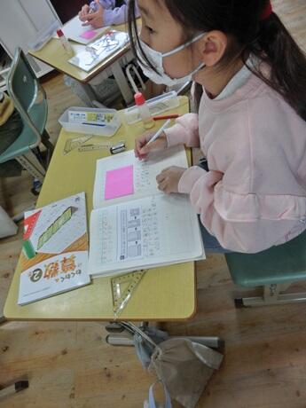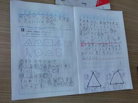 同じようにきれいにまとめられています。こうしたノート指導は、「算数の学習というのは、こんなふうに進めていくんだよ。」という先生からの導きになると思います。こうした記録を継続することで、学び方を学ぶということにつながります。アナログですが、小学校の児童にとって、「鉛筆で書く」という活動は、軽視してはいけないのだと思います。