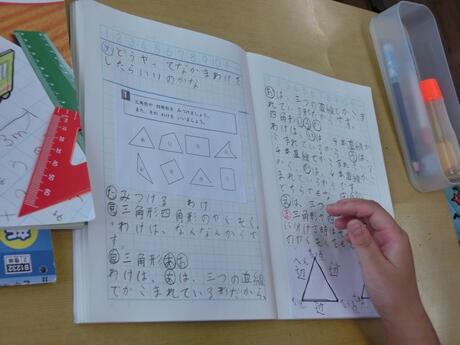 こちらが、同じ2年生の先週の算数の時間のノートです。学習の記録がきちんとまとめられています。別の児童の同じ時間を見てみると、
