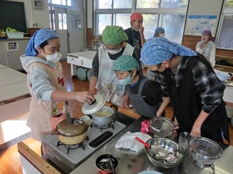 今日は、5年生が朝から調理実習に取り組んでいました。メニューは、「ご飯と味噌汁」です。