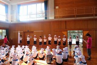 本校の養護教諭が、8月9,10日に自身が参加した愛媛県西予市でのボランティア活動について全校集会で話をしました。