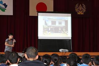 災害現場での苦労やそこで活動する人々の思いなどについて、写真映像を交えながらの話に全校児童が真剣な表情で聞き入っていました。話の結びに、活動に参加し、学んだこととして、困難な場面に立ち向かったり、行動したいと思うときにその力の源となる「自分の体の健康の大切さ」や日々の学校や日常生活の中でもある「人(相手)の立場になって考えることと実際に行動することの大切さ」を児童に呼びかけました。