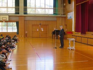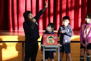 1月29日、学校栄養職員が講師となって食育集会がありました。箱の中身は何?学級代表児童が手触りで箱の中にある「野菜」を当てるゲームを通し、キャベツやニンジン、キュウリ、大豆などの栄養や働きについて楽しく学びました。