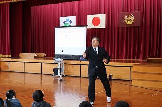山田小の運動場にはおもしろい木がたくさんあること、かえでの種はどのように飛ぶのかを紹介され、子どもたちから「知ってる!」「おぉ~!」と声が聞こえてきました。身近なことにいろんな感動があることを教えてくださいました。