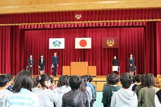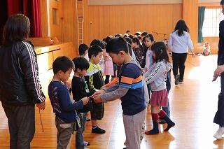 代表児童に教科書が授与されます。これからたくさん勉強をがんばりましょう。