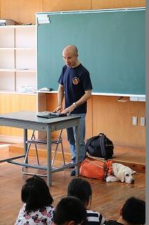 10月11日(金) 3,4年生の総合的な学習の時間に蔵元さんをお招きして盲導犬についての学習が行われました。実際に盲導犬のチャンピーと一緒で、子どもたちも話の内容と盲導犬の様子を見ながら興味深く聞き入っていました。盲導犬は仕事をしているのだということ、仕事中なのでむやみに名前を呼びかけないことやさわらないことなど初めて知って驚いたことも多かったようです。本当に相手の立場に立って物事を考えることの大切さも学んだようです。