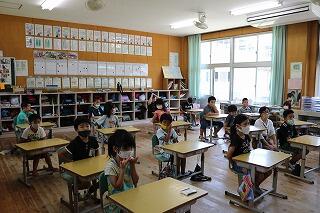 県内で新型コロナウイルス感染症患者が発生したことを受け、本日の終業式は、各教室で行いました。各学年の代表児童が、1学期を振り返って頑張ったこと、2学期も頑張りたいことを放送室をとおして発表してくれました。初めての経験でしたが、どの児童も堂々と発表ができていました。放送室は、換気の徹底、退室後は手指のアルコール消毒液を行う等配慮しました。